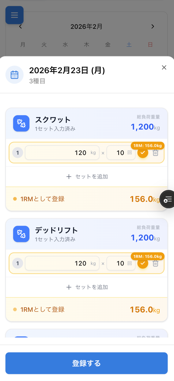入力したデータから推定1RMも自動で計算するため、どれくらい強くなっているか?を数値で把握できるようになります。