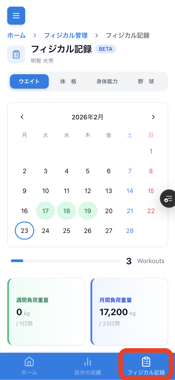 スマートフォンでログインしている場合、選手アカウント(選手と連携済みのユーザー)には「フィジカル記録」ボタンがフッターに表示されます。