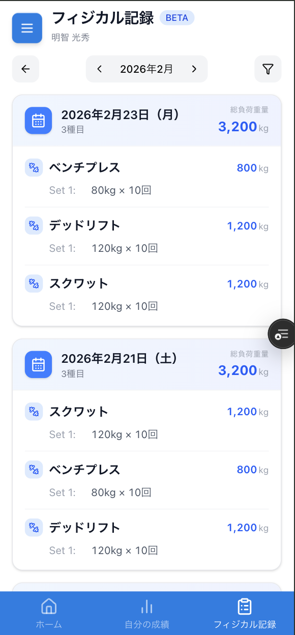 各種目ごとに、「80kg × 8回 × 3セット」のような実際のトレーニング内容をそのまま記録できます。