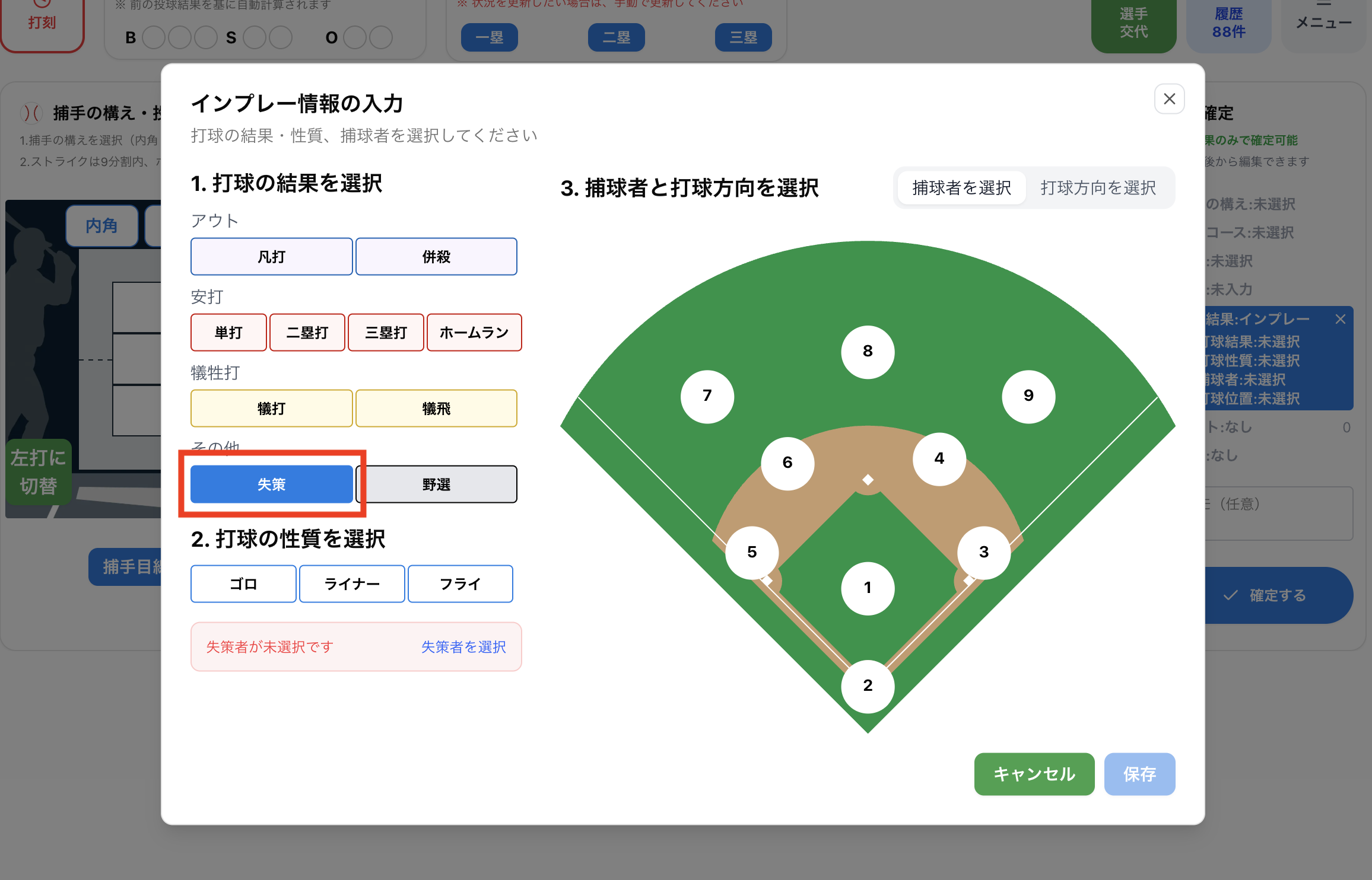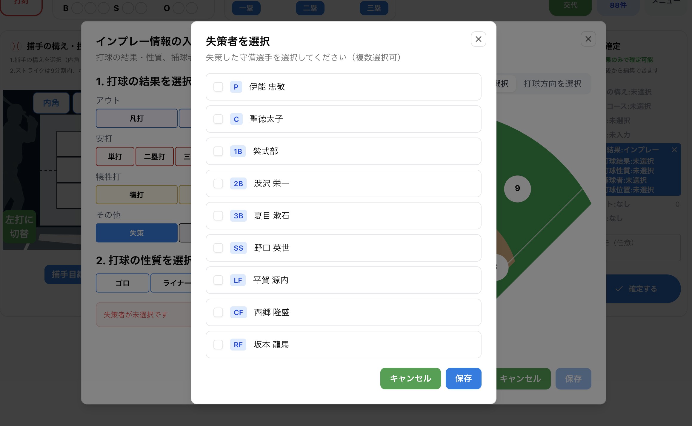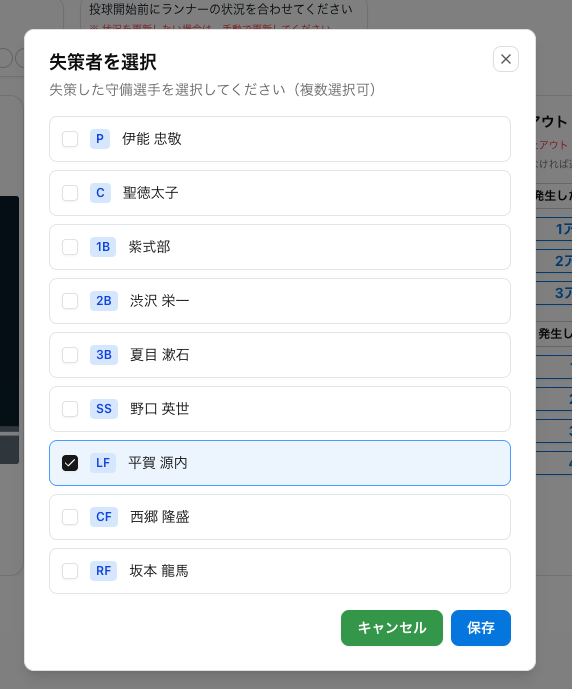 今回のアップデートにより、失策した選手を選択して記録できるようになりました。