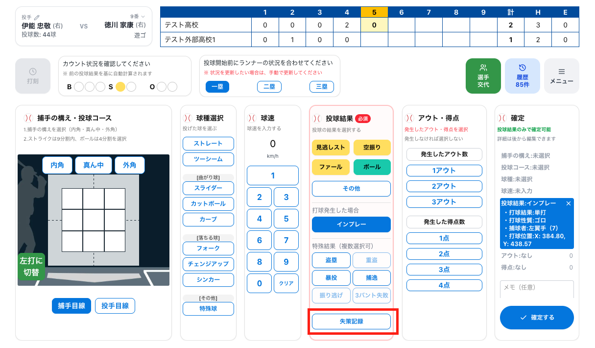 ② 失策記録ボタンを選択